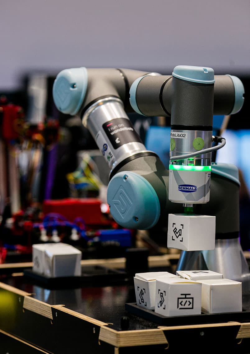 Ein Beispiel: Erkennt das Testbed einen drohenden Verschleiß am Förderband, können Servicepartner über den Datenraum darauf zugreifen und automatisiert Ersatzteile liefern, Wartungsarbeiten veranlassen oder Anweisungen an den Werker übermitteln. Im Popup Testbed wird dies durch die Bewegung des Roboterarms anschaulich symbolisiert.