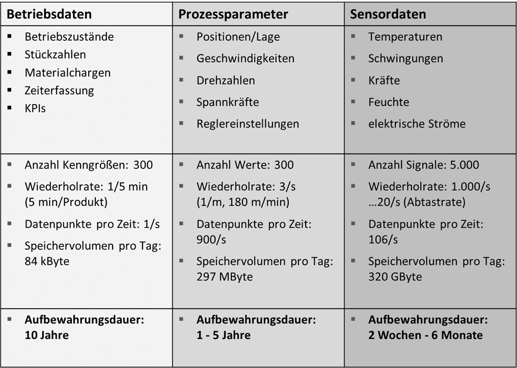 Eine erfolgreiche datenbasierte Optimierung basiert meist auf der Integration vielfältiger Daten aus dem Produktionsprozess, beginnend bei ohnehin in der Produktionsplanung und -steuerung erfassten Daten wie Durchlaufzeiten oder Daten der prozessierten Materialien, über Daten, die die Steuerungen von modernen Produktionsanlagen nutzen (Maschineneinstellparameter), bis hin zu punktuell zu erfassenden Sensordaten wie Temperaturen, Prozesskräften oder Schwingungen. Tabelle 1 zeigt beispielhaft, wie hierdurch an einer Produktionsanlage in kurzer Zeit immense Datenmengen entstehen können.