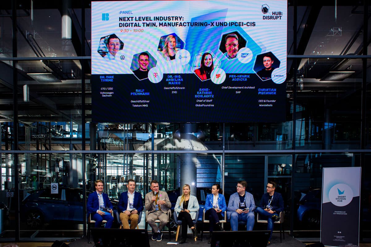 Die hub:disrupt 2025 überzeugte mit einem abwechslungsreichen Programm, das von Keynotes über die Topic Islands bis hin zu besonderen Formaten reichte. Das Eröffnungspanel „Next Level Industry: Digital Twin, Manufacturing-X und IPCEI-CIS“ brachte führende Vertreter von Volkswagen Sachsen, Telekom MMS, GlobalFoundries, SAP, Wandelbots und Scale-MX zusammen. Eindrucksvoll zeigte das Panel zum Global Thingkathon, wie Co-Innovation in Echtzeit funktioniert, während beim InnoSpeedDating wertvolle Kontakte geknüpft wurden. Das de:hub Meet & Greet vereinte die Community der Digital Hubs und förderte den überregionalen Austausch.