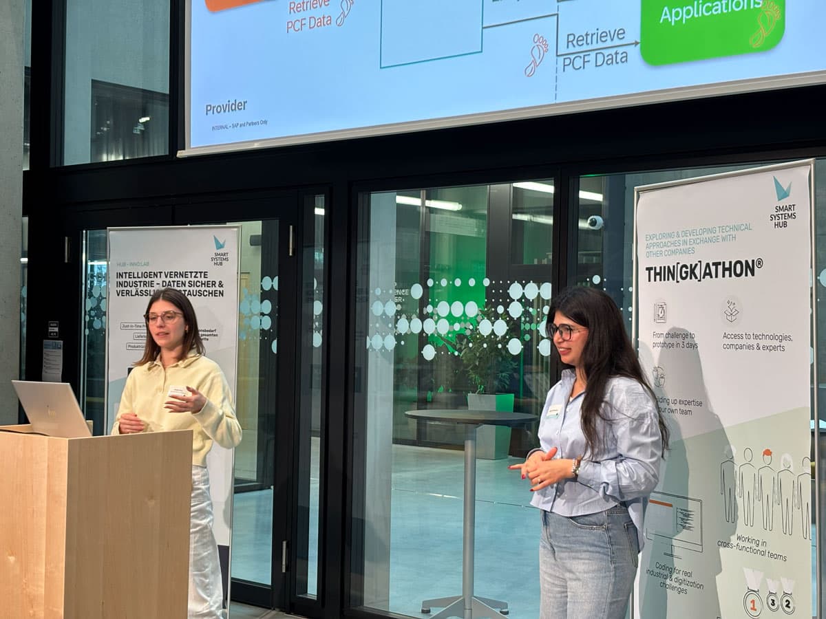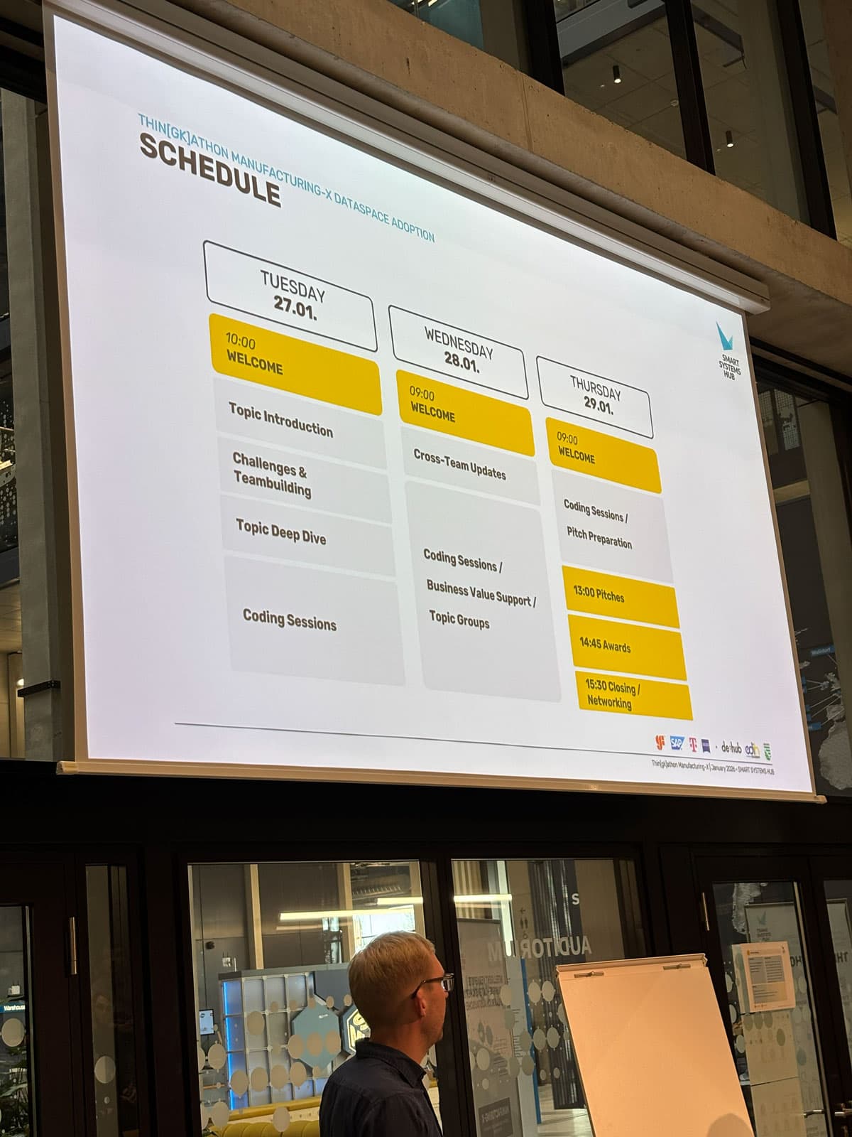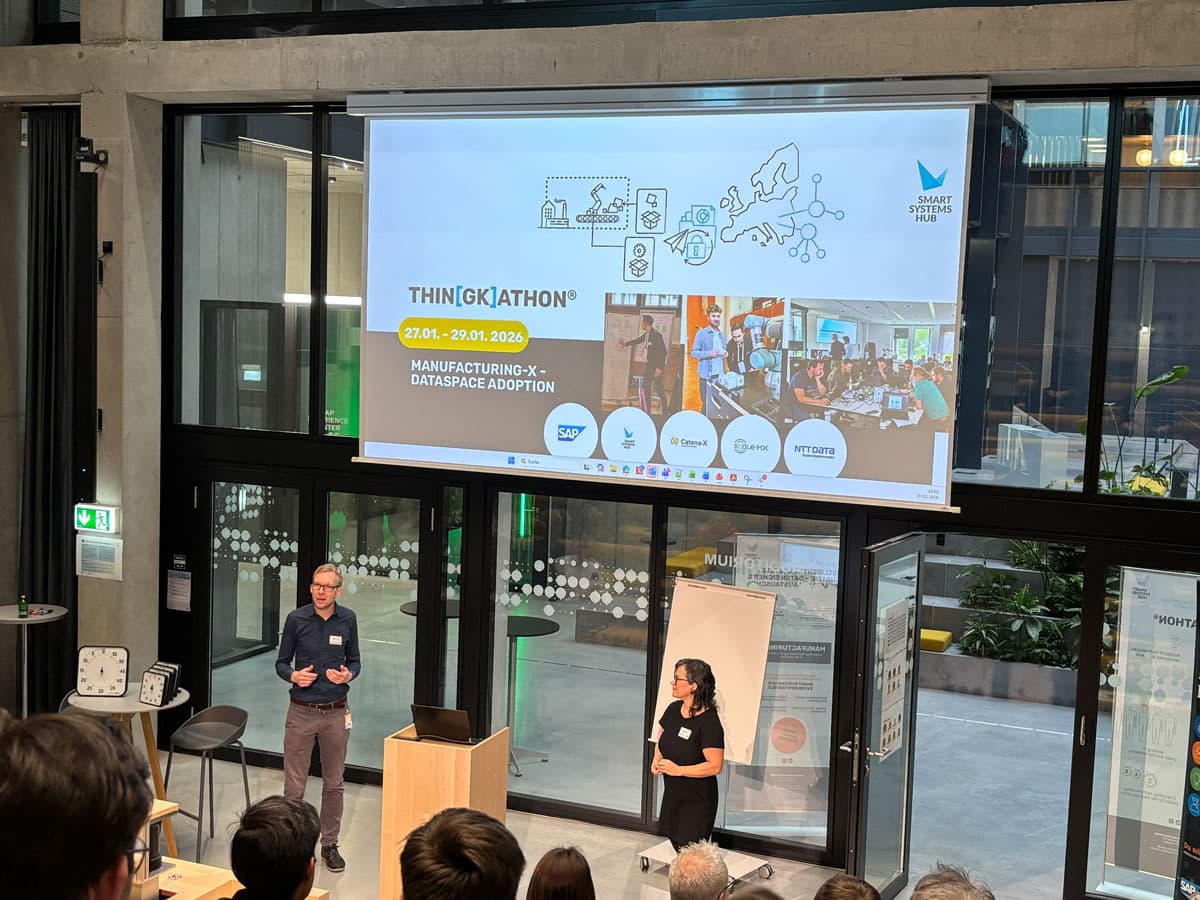 Nach drei Tagen intensiven Arbeitens, Tüftelns und Prototypings war es soweit: Die Teams des Thin[gk]athons „Manufacturing-X – Dataspace Adoption“ präsentierten ihre Ergebnisse. In fünfminütigen Pitches zeigten sie, wie aus ersten Ideen konkrete Lösungen geworden sind – immer mit klarem Bezug zu Fertigung, Datenaustausch und realen industriellen Herausforderungen.
