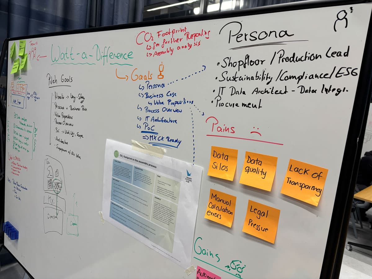 In unserer neuen hub:station München starteten alle 35 Teilnehmenden in interdisziplinären Teams direkt ins Machen. In offener, kreativer Atmosphäre wurden konkrete Use Cases bearbeitet – von Supply-Chain-Transparenz über Product Carbon Footprint bis zum Battery Product Pass – echte Herausforderungen aus dem realen Unternehmensalltag.