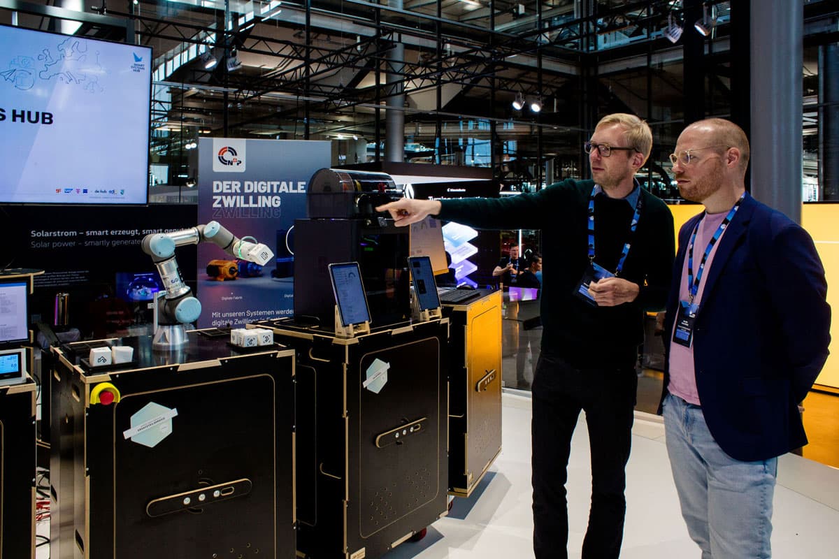 At the center is a physically constructed demonstration facility consisting of a fischertechnik model factory and a robot arm, which exemplify how digital data rooms work in real processes. Both systems are networked via a decentralized data room and interact autonomously. Guests experience live how status data from the virtual production facility – the digital twin – triggers process-relevant decisions.